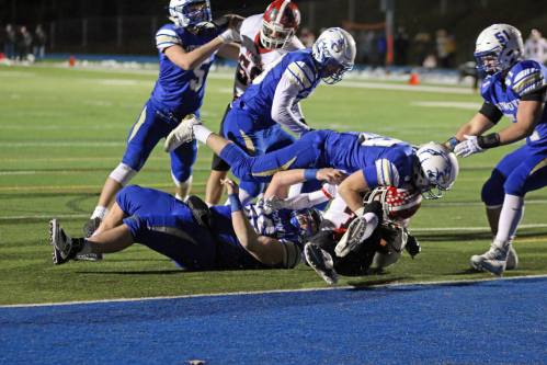 After an empty first half, the Hawks scored on their first possession of the second half. Junior Luke Hannon (109 yards) covered the final two yards and senior Devin O’Connell kicked the extra point.