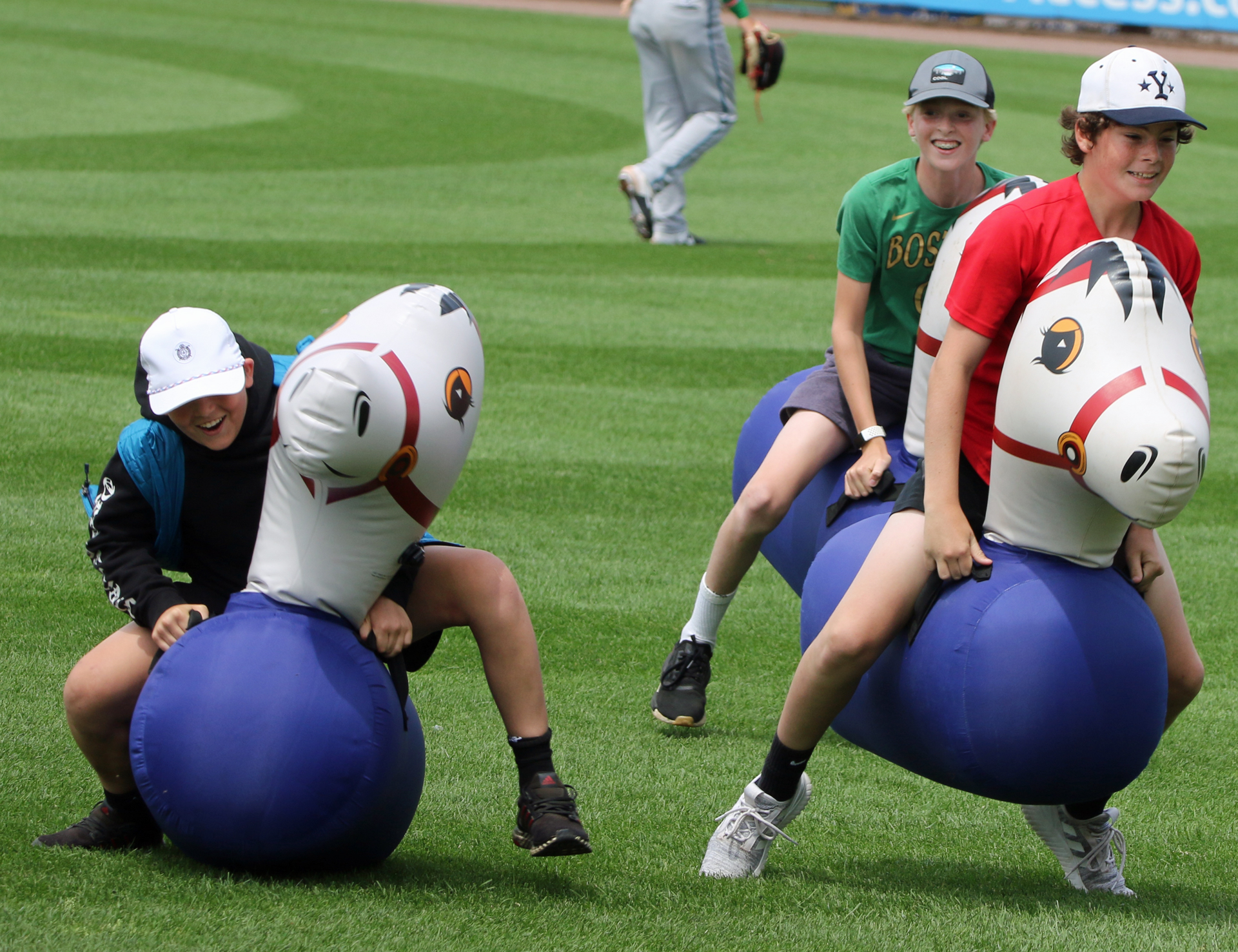 Another race loss for Hall-of-Fame mascot Slugger. The Big Guy (not Biden) was up against a camper from O-AT-KA in Sebago. They were even heading into the final stretch, but Slugger couldn’t finish. He does a lot of walking around the stands greeting patrons before he does the race. That could well be taking the legs out from him.