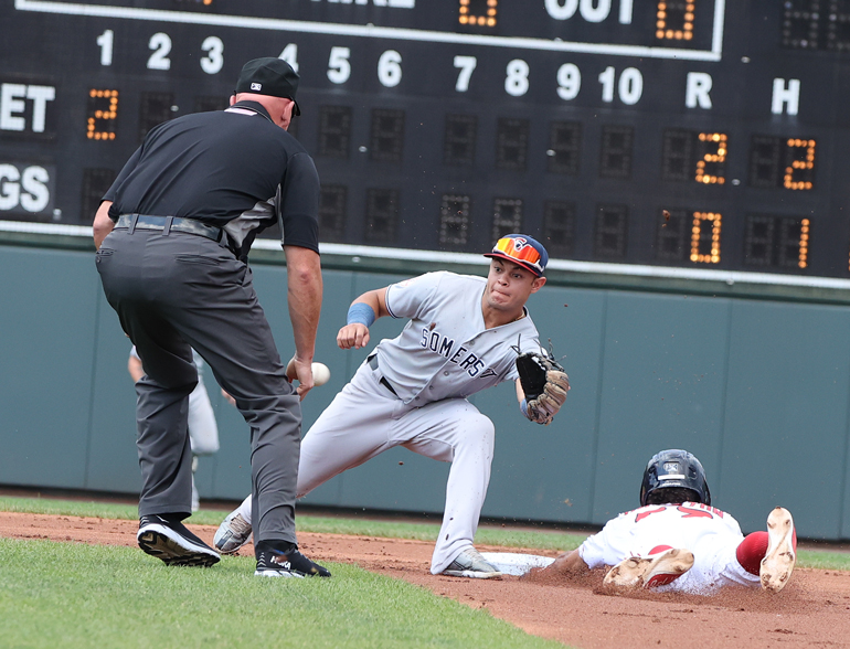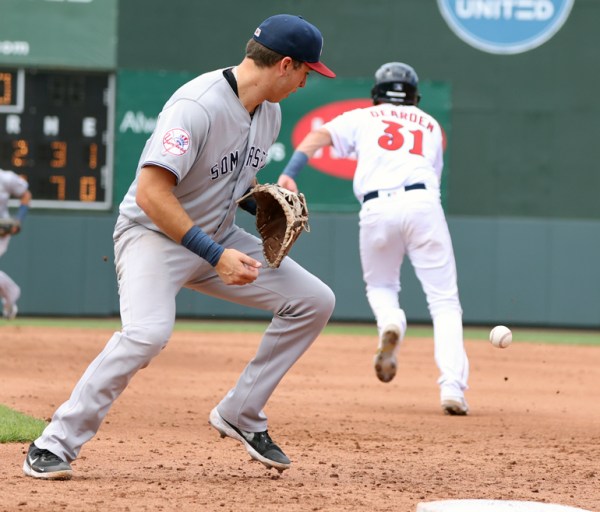 A player I was looking for was Max Burt. Max attended St. John’s (Danvers). When I saw the Somerset team in NH, Max didn’t play. However, the day before today’s game Max had hit two home runs. Today, he collected a couple of hits.