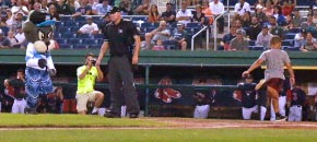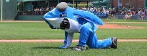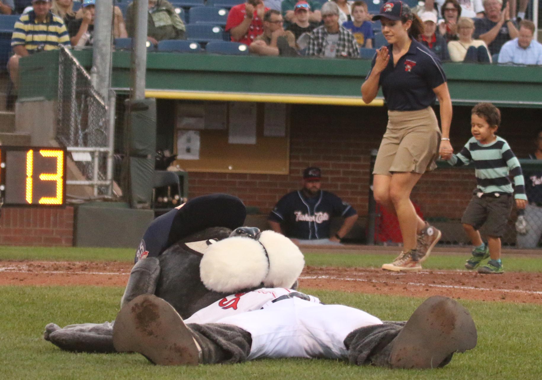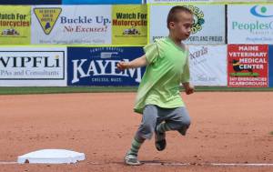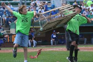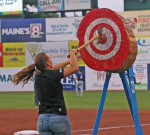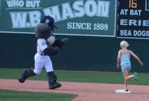 Musical chairs, on this night, was the highlight of the between-innings activities in my opinion. The young ladies involved were excited. I’m guessing 5-year-olds. It was quickly obvious that none of them had ever played musical chairs. They saw chairs and they jumped on them! Of course, you jump on an inflatable and it’s likely to fall over…and they did. The music played and the girls were already all over the chairs. Next they learned that they had to wait until the music stopped before taking a seat. One girl waited beside an empty seat instead of getting into it. That didn’t go so well for her. It was also interesting to watch the girls enlarge the circle by running around the Hadlock staff members as well as the chairs. A winner was finally determined but because of the size discrepancy between the chair and the participant nearly vanished from sight. The crowd loved it.
