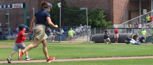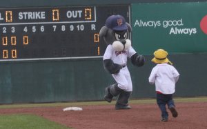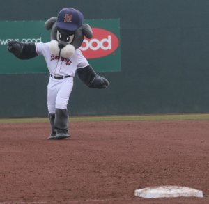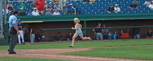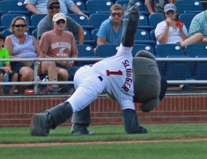 Another race loss for Hall-of-Fame mascot Slugger. The Big Guy (not Biden) was up against a camper from O-AT-KA in Sebago. They were even heading into the final stretch, but Slugger couldn’t finish. He does a lot of walking around the stands greeting patrons before he does the race. That could well be taking the legs out from him.