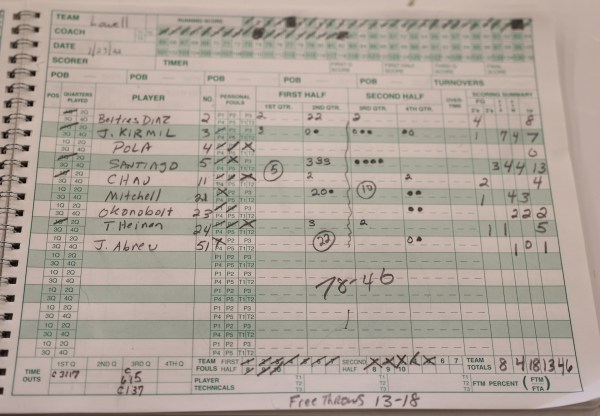 The visitors trailed, 16-5, after a quarter but held their own in the second quarter. Jeter Santiago (13 points) hit three times from long range to keep Lowell (2-5) in range, 39-27, at halftime.