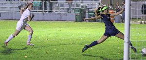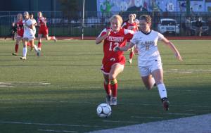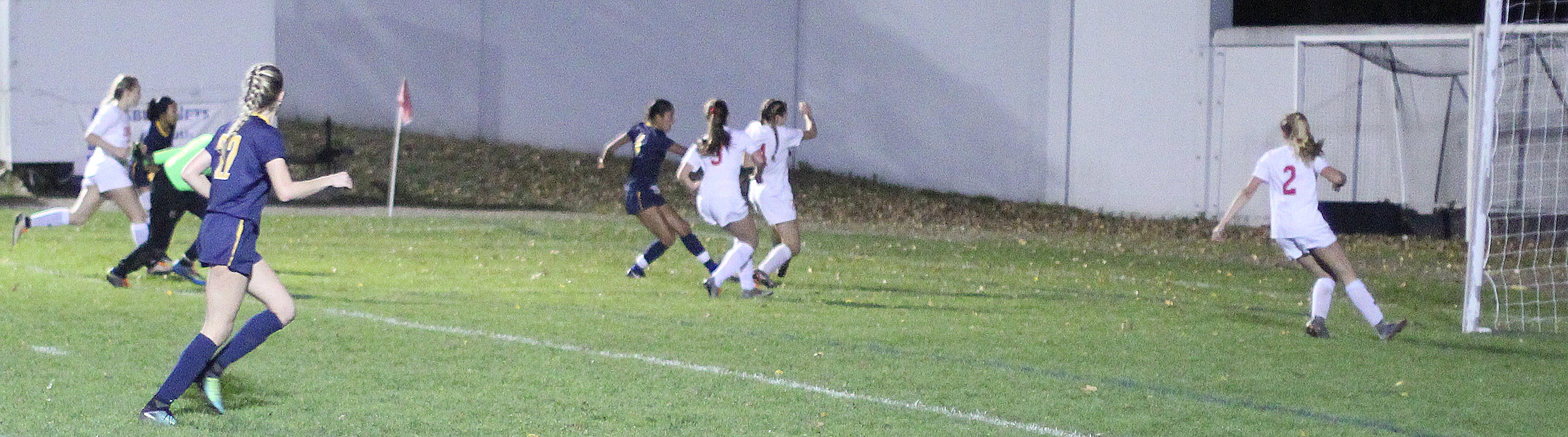 Alyssa Pettet took the kick from straight away. Her kick came toward Spartans goalie Adrianna Bowker. Chelsea Lynch was nearby contesting the oncoming shot.