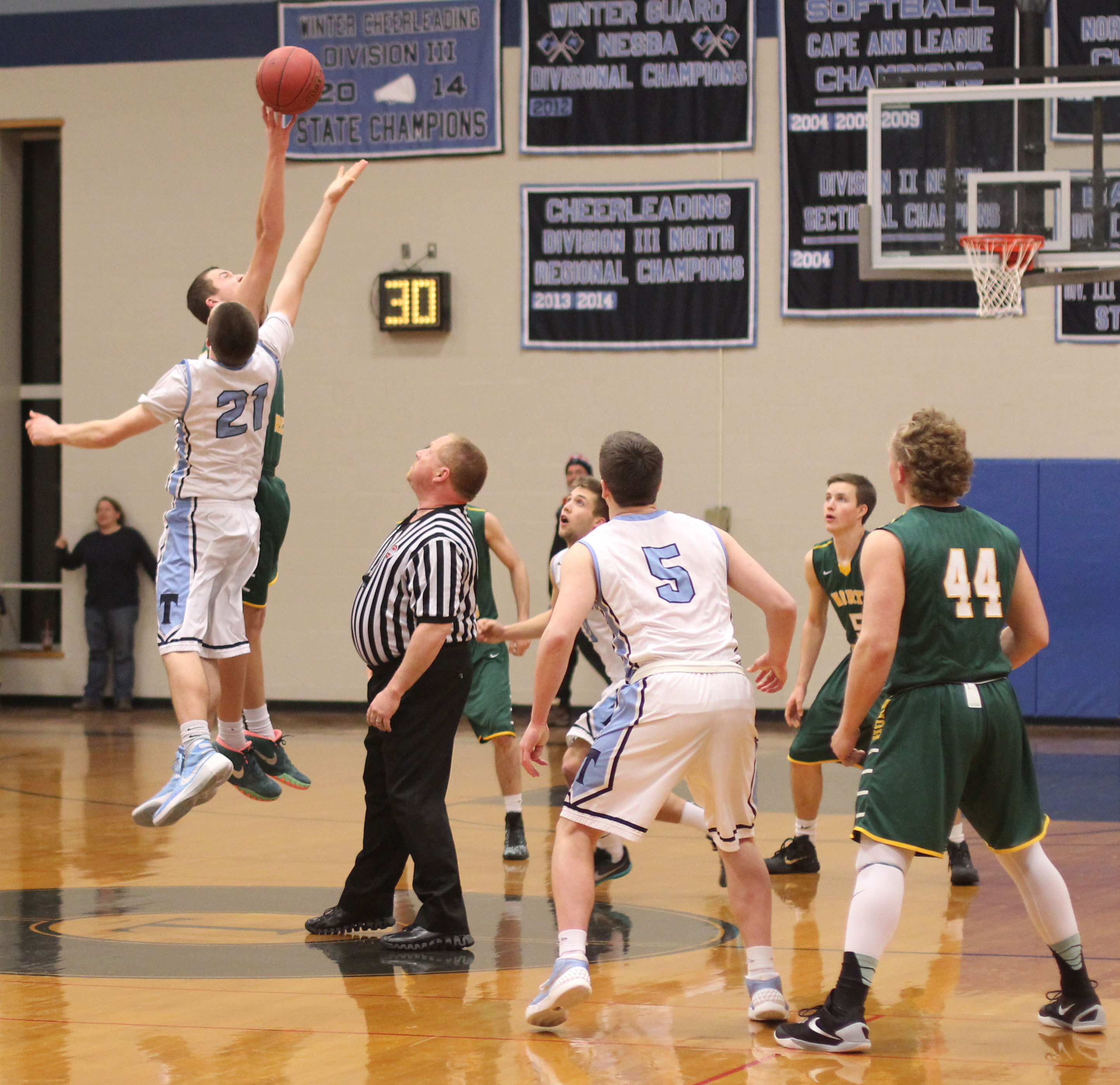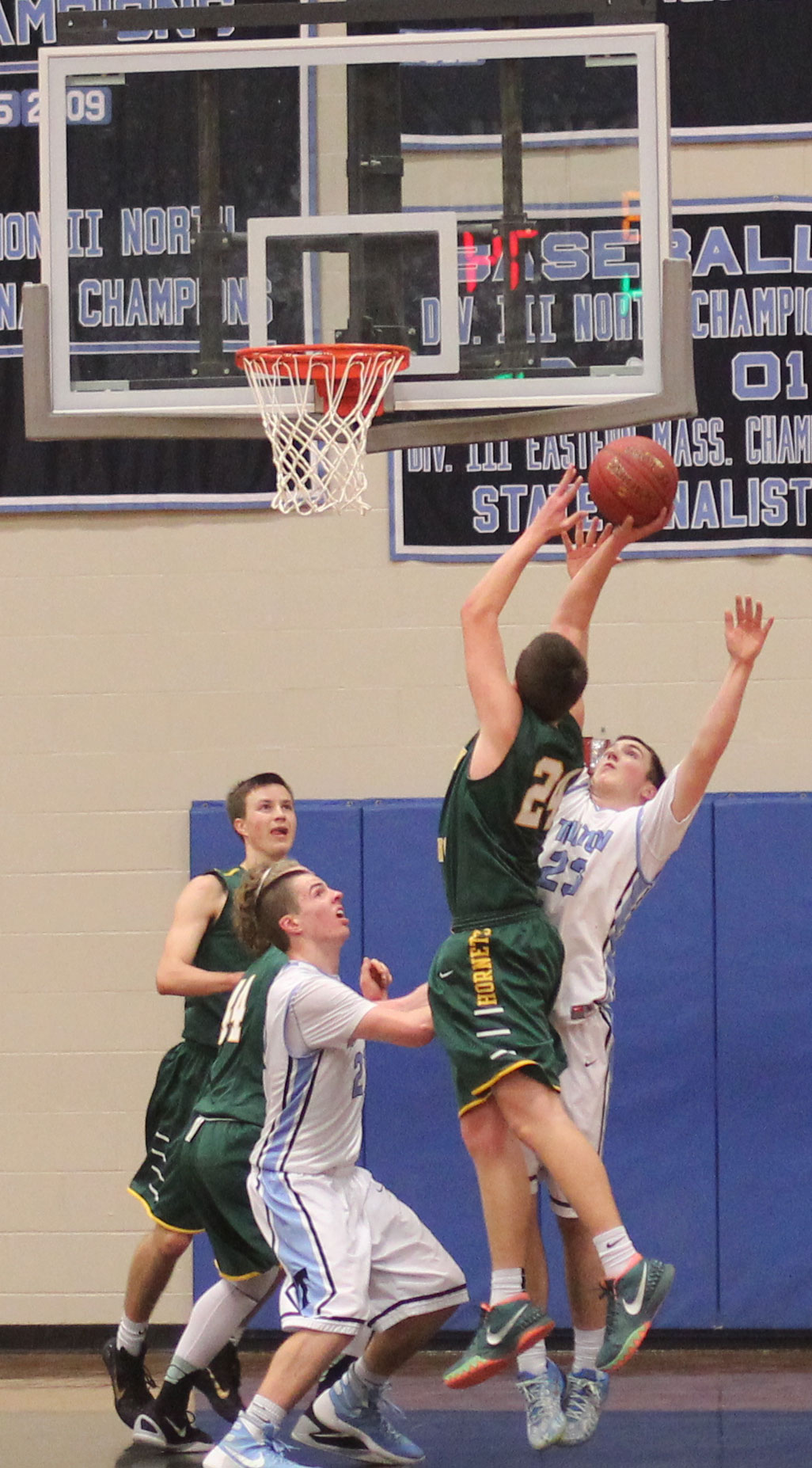 Key player for North Reading? Easily it was senior Adam Goldstein (28 points). He was huge in the last minute. Clinging to a one-point lead in that final minute the Hornets passed around the perimeter before Justin Dorosh set up Adam for a straightaway long one. Swish! Now up by four. Eric Rybicki got in for a layup and Triton was within two points with fifteen seconds left. Adam was quickly fouled and calmly sank both free throws and the lead was back to four. Triton missed two shots on their final possession and NR had the win.