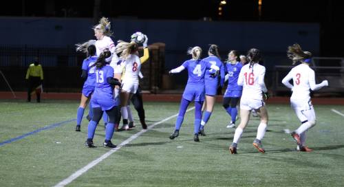 Also in the first half a hard Brookline entry shot bounced loose from Natick goalie Allison Jeter but her teammates were there to clear the ball away.