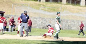 Later in the fifth, Connor Wile put down a suicide squeeze bunt with Brett Fontaine heading full-speed from third.  Cougar catcher Joe Barry blocked Brett away from the plate before he had the ball and the umpire awarded Brett home.  Sam Barlow followed with a walk driving in the sixth run (Jim Conway) of the inning and boosting Newburyport’s advantage to, 8-2.