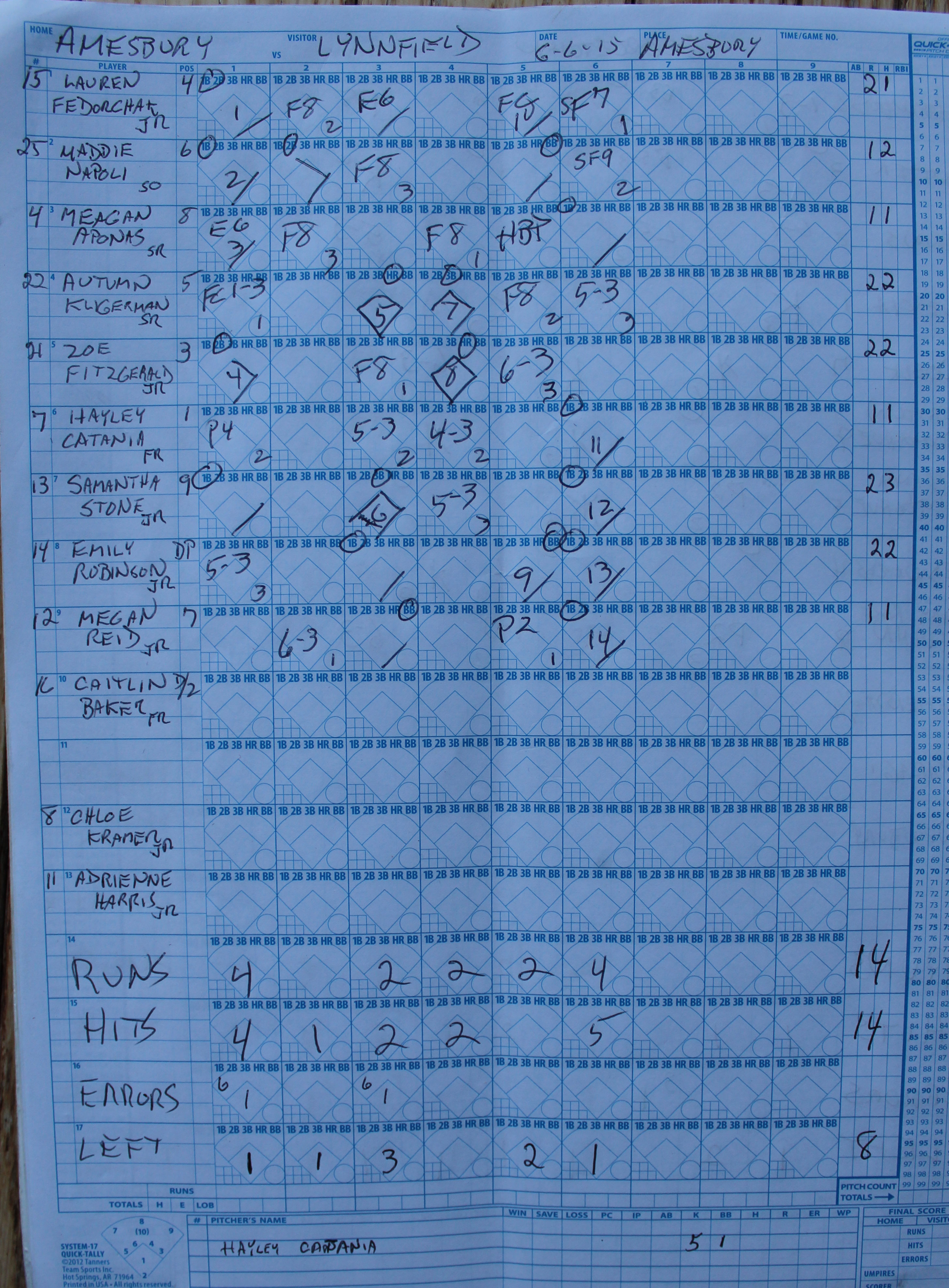 In the Rockport third, an Emily Faulds’ single to right with two outs drove in Miranda Roller. On the same play Kayla Parisi reached third and literally stole home unnoticed by the Amesbury infield. Meagan Aponas made a nice catch in center to end that inning.