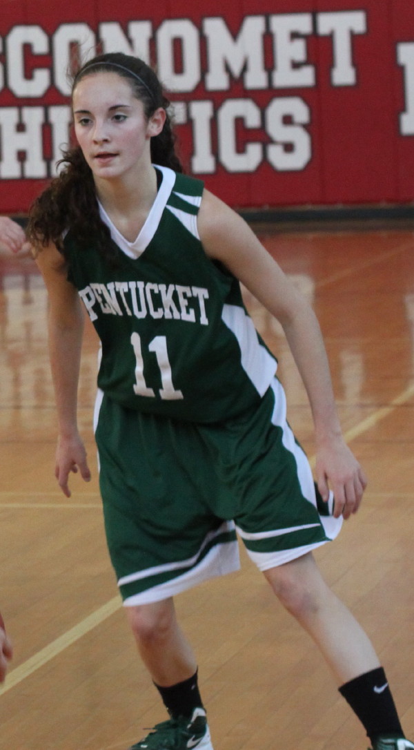 Pentucket (7-0 in Cape Ann League D1 / 11-4 overall) lost Tess Nogueira (groin injury) with a minute left in the third quarter and the score tied at 37-37. I thought at the time that Pentucket might be in serious trouble because Tess had shadowed Brooke Stewart into a non-factor status. But Alex Moore took over and, although at least six inches shorter than Brooke, was able to limit the talented senior to just four points the rest of the way.