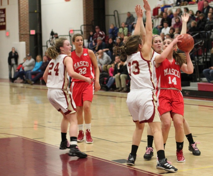 Masco’s Katie Hutchinson missed the front end of a one-and-one with fifteen seconds left. Coley Viselli (16 points) took the rebound and was immediately fouled. She made both free throws to stretch the Pentucket advantage to 56-52.