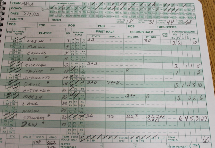Meanwhile, down the other end was Pentucket’s John McNamara. He spent more time on the court than most of his players. I did see him kick the bench – I have a coaching friend who broke a toe doing that. John had a legitimate complain late in the game when someone in the Masco band used their trumpet (?) as a noisemaker while Coley Viselli was shooting free throws. Earlier, with 4:16 left John got hit with a technical foul. Brooke Stewart made both technical foul shots.