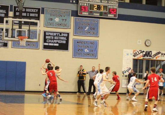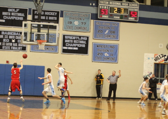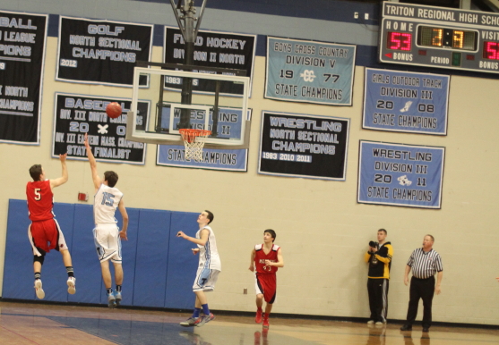 Seniors Cam Armand (22 points) and Corey Parsons (21 points) had exceptional games for the winners. Cam made 17-of-22 free throws in the second half while Corey tallied twelve points in the first quarter to drive Triton to a 17-6 start.