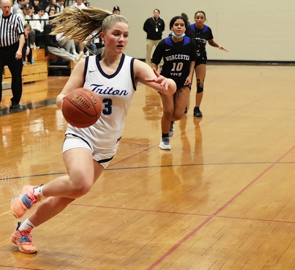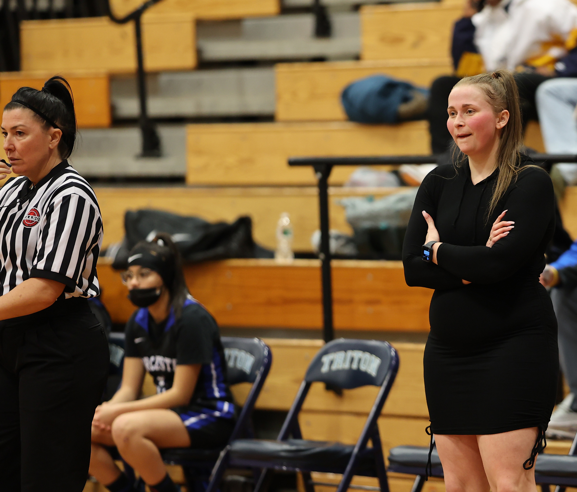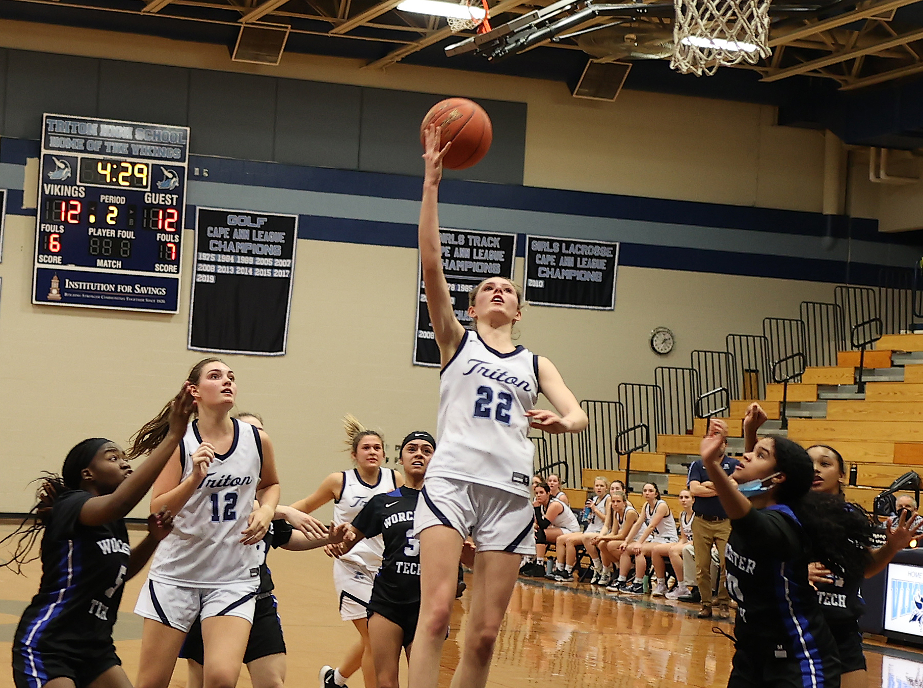 Two minutes later a Molly Kimball (13 points) three-pointer boosted the Triton edge to twenty points, 37-17.