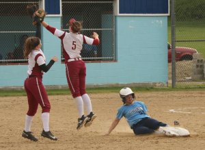 Christina Clark slides home with the second Burlington run as catcher Liv Doane waits for the ball to arrive