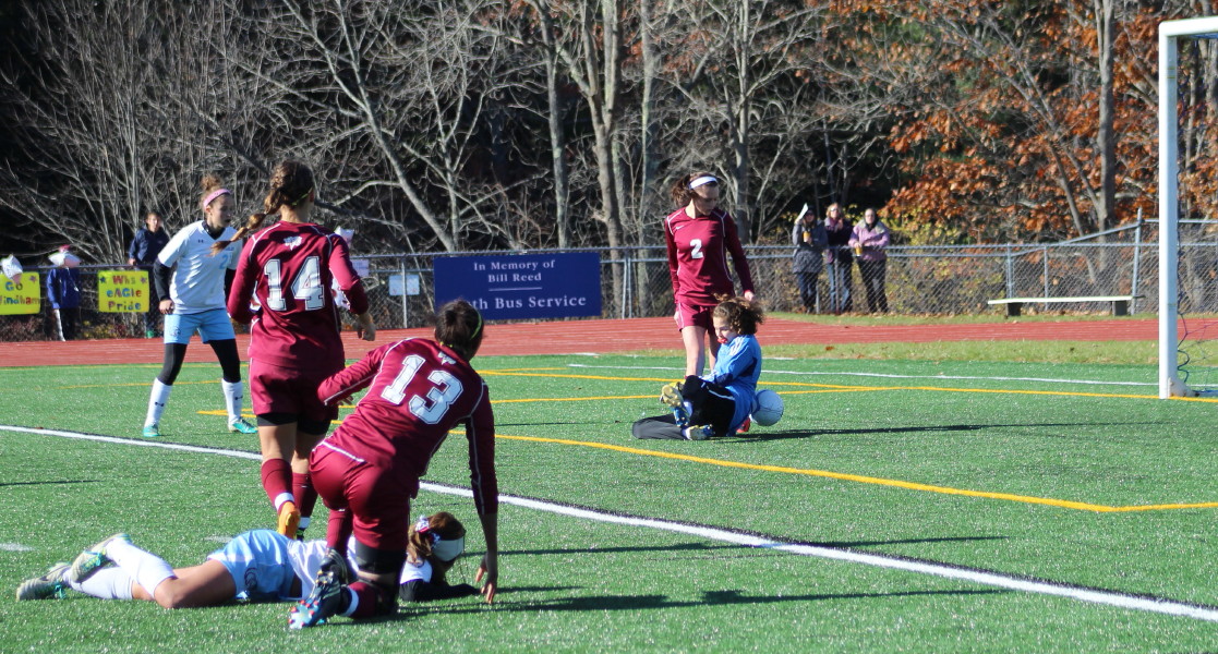 Abbey was in the middle of some more excitement in the final two minutes in front of the Scarborough net. The ball got into the box with lots of players there. The ground was mushy and players from both sides were struggling to get a foot on the ball. Down went Abbey as she tried to get control. Foul? Not according to the official. That lack of a call didn’t set well with Windham afterwards. My picture of the action, however, would suggest that Abbey fell over the ball and would justify the lack of a whistle.
