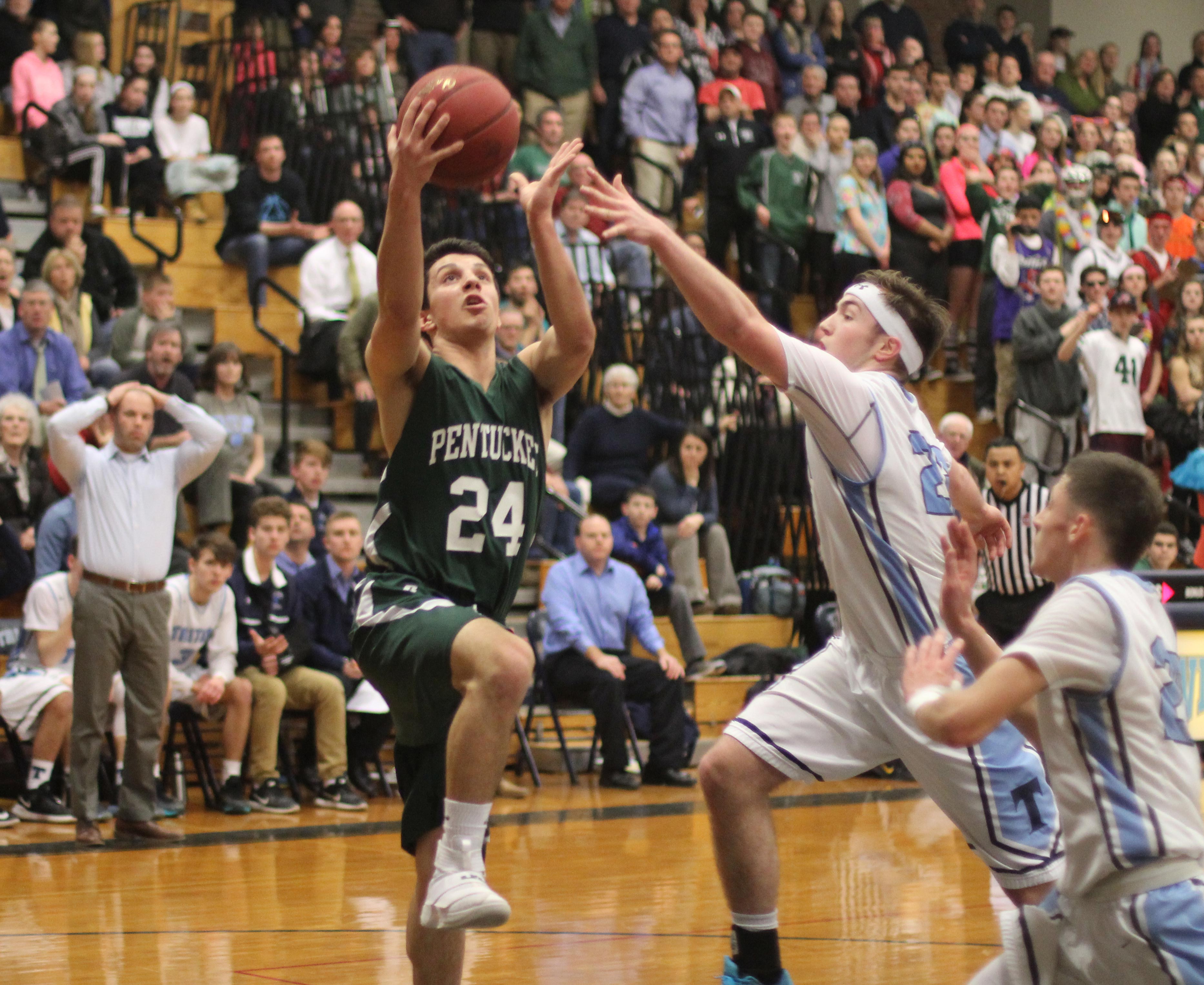 Time for Pentucket to look to be in serious trouble. But with two close games versus Triton this season you suspected that they weren’t done. An old-fashioned three (Nate McGrail), a jumper (Spencer Pacy), and a Conor O’Neil triple put Pentucket within two 38-36 with 3 ½ minutes left. Anyone’s game.
