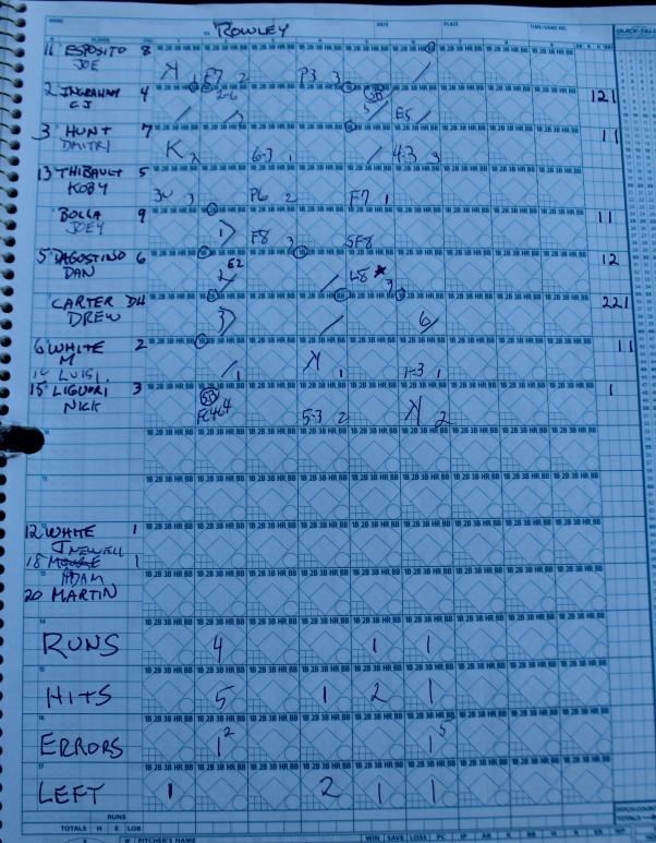 If Brett Cahill’s fly to right in the 7th was the longest out, Cam D’Agostino’s rope to center in the Rowley fifth was the hardest hit for an out in the game. Cam’s laser to center was right at CF Rory Gentile and he made the catch for the final out.