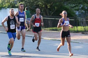 One of the unique features of the 10-miler is that a 5K starts on the same route ten minutes earlier. That makes for some interacting of the two races about a mile in as well as at the finish. There are serious runners and there are those wanted to try it.