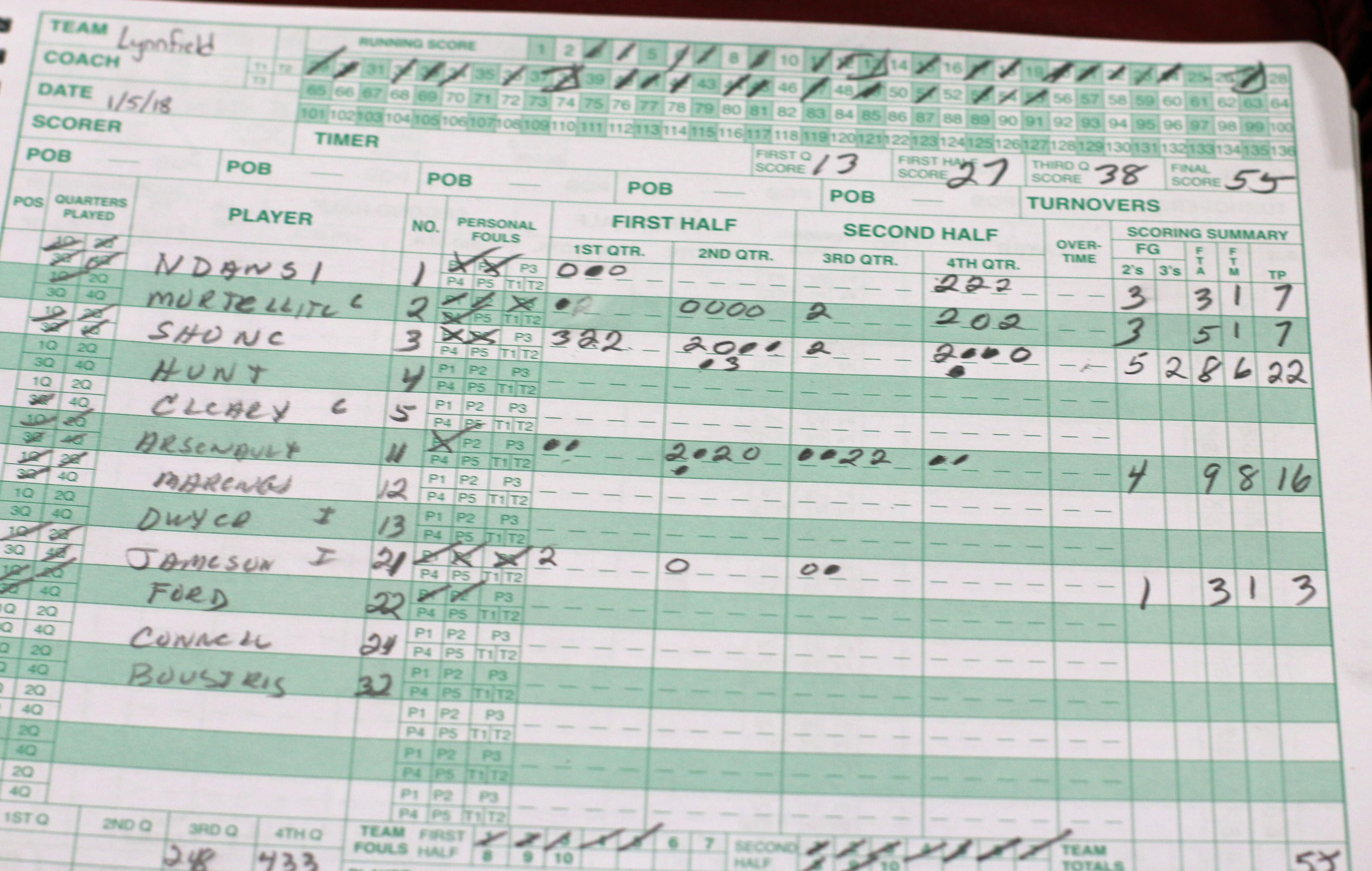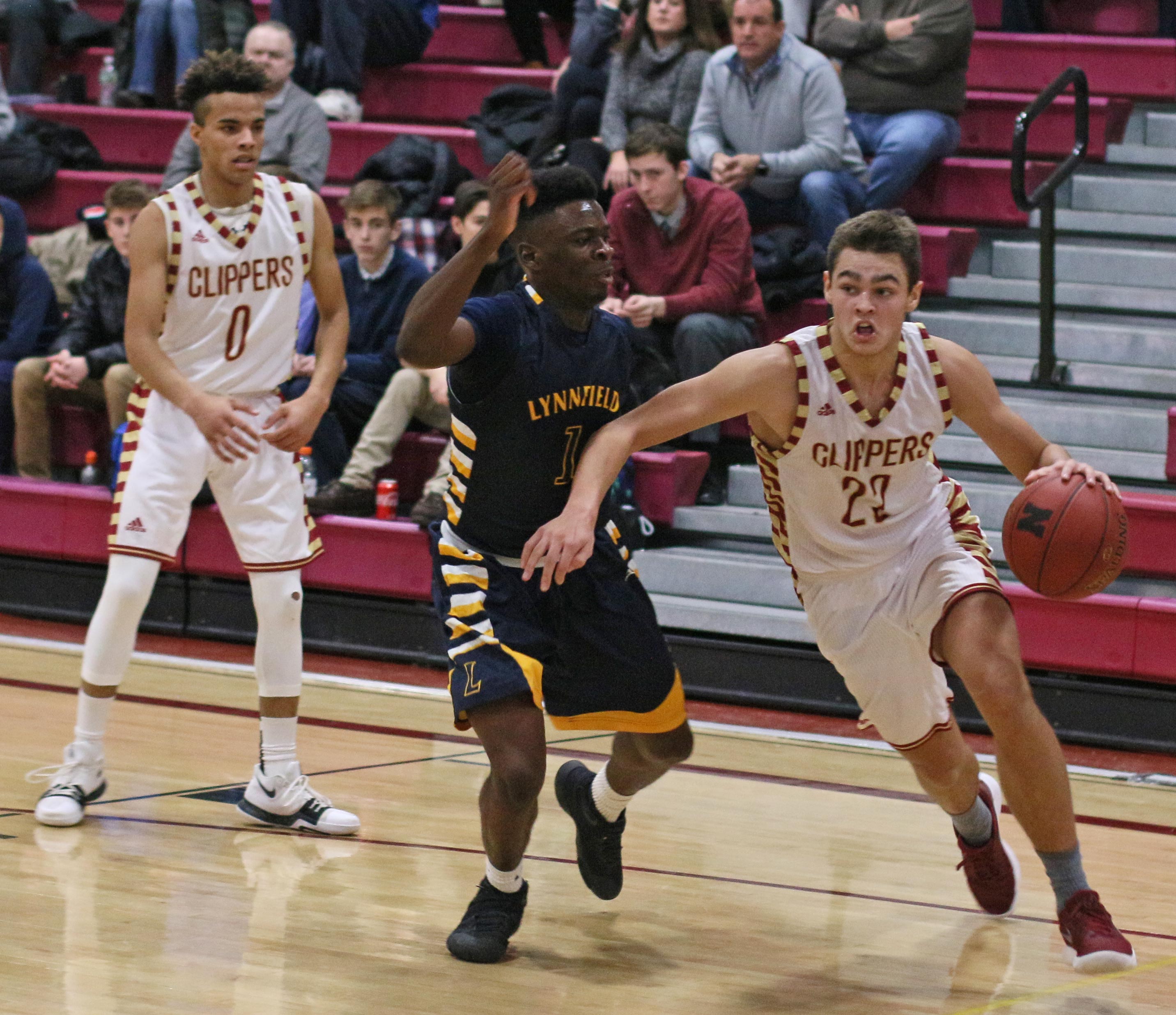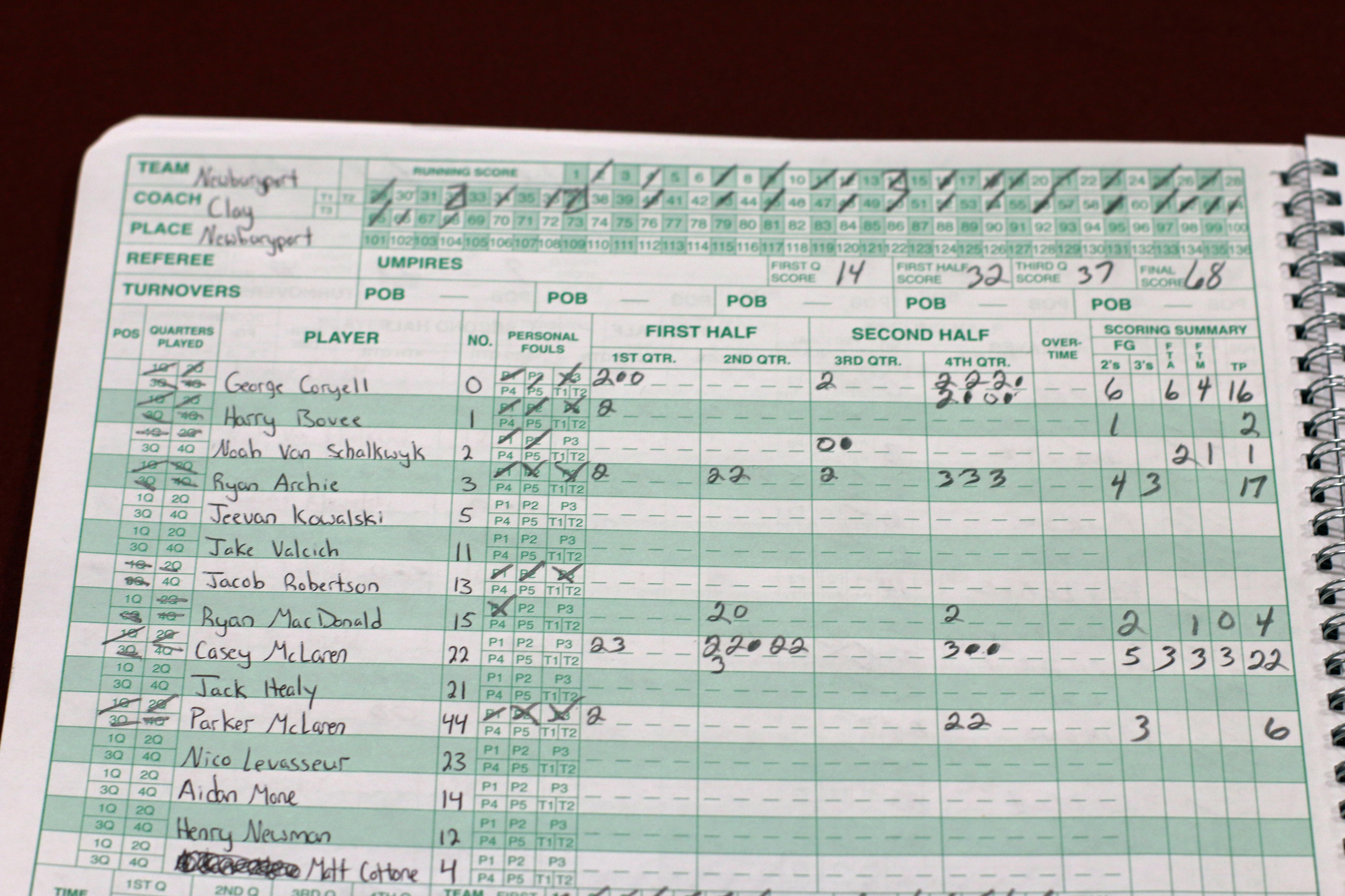 The Clippers led 12-10 after one period. At halftime, the teams were even, 27-27. The third quarter ended with Newburyport in front, 40-39. In the final quarter, the scored was tied, 54-54, with 1 ½ minutes remaining.