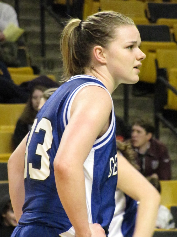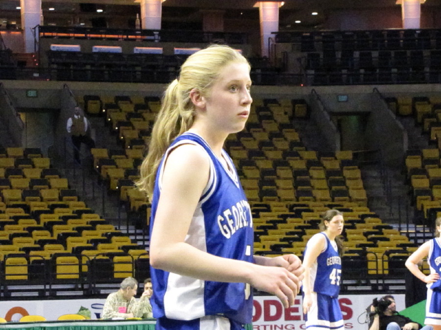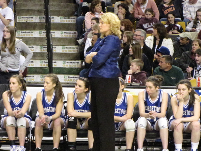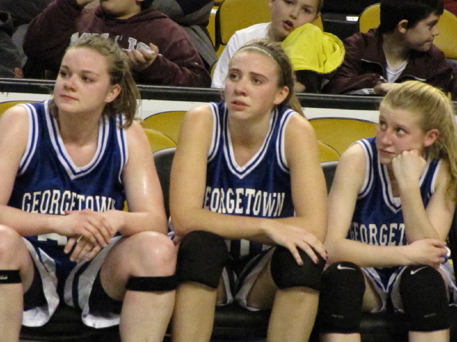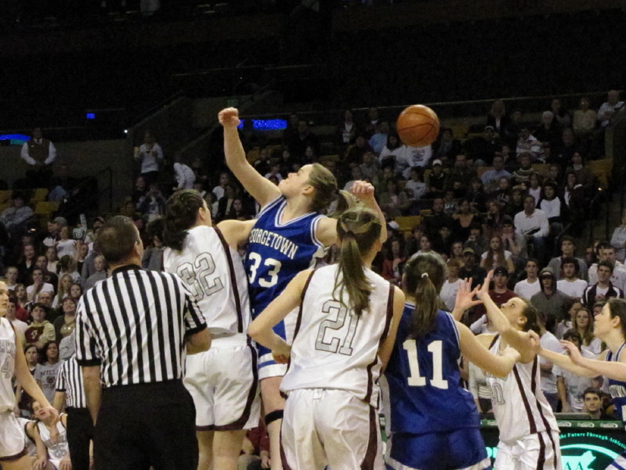 Kristin Hogan injured fingers on her shooting hand early in the third quarter. She was out of the game for a while. The rest may have helped her as she scored Georgetown’s first ten points in the final quarter in the first 2 ½ minutes.