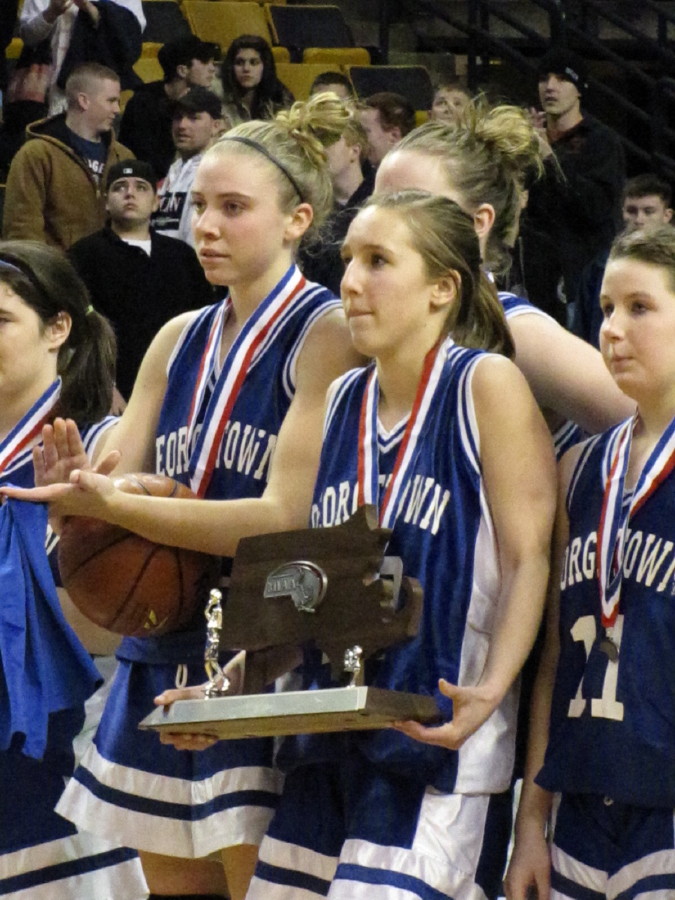 Kristin’s quick four points put Georgetown in front, 56-55, with 5 ½ to play. A Morgan Gott triple boosted the advantage to 62-58 with four to play. But back came Whittier on a three by Christina and two free throws from Catherine Roache to tie the game 63-63 with 2 ½ minutes left. The Royals made the big plays thereafter and came away with the tournament win.