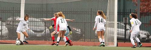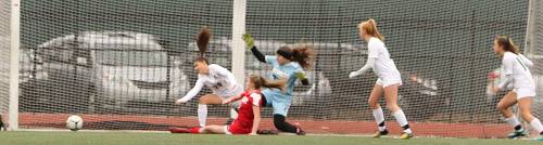 Avery “insisted” that the shot would have gone in without her sister McKenna’s “help.” My pictures tell me, however, that McKenna’s part was essential. She dove feet first into a ball that was just about to be cleared out and sent it into the left corner of the net.