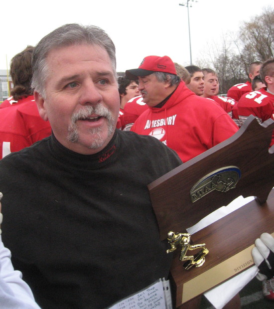 At game’s end, the Super Bowl trophy was presented to the Amesbury captains at midfield. Up on the team’s shoulders went Coach Connors with the trophy raised to the skies.