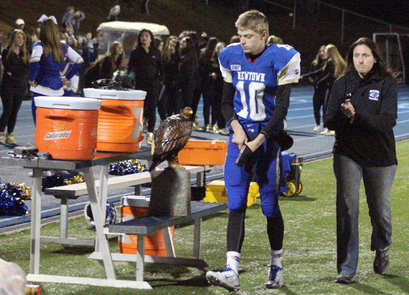 Running back Jaret DeVellis was in uniform for Newtown but didn’t play. “Jaret could have played but we wanted to do the right thing with him and give his ankle more time to heal,” said Coach George. I watched Jaret in pregame and, despite his best efforts, he still wasn’t running without limping.