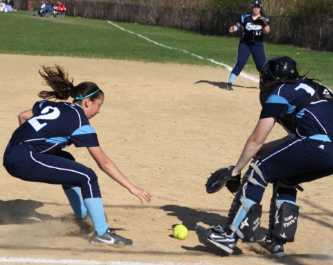 Third baseman Rylee Culverwell and catcher Julia Hartman had trouble with Autumn Kligerman’s bunt in the fourth inning.