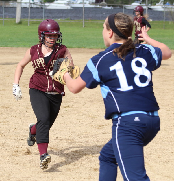 In the bottom of the seventh the Clippers put three on the board to tie but Vicki Allman was tagged out going for the game winner.