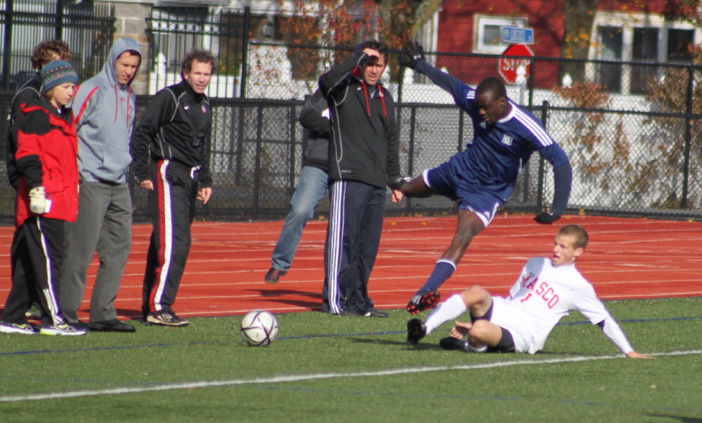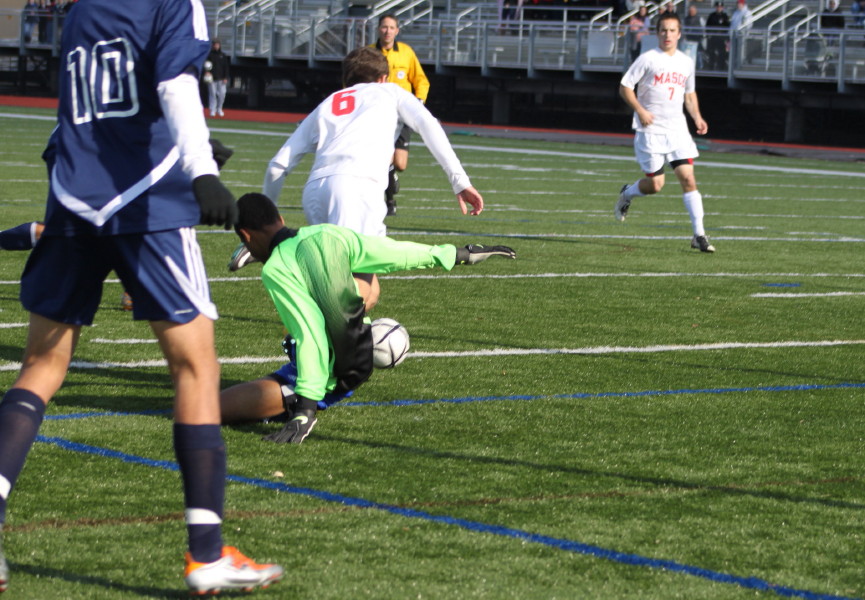 A very important part of the Chieftain victory was the way that Wes Shrewsbury marked John Dumbuya of Medford. In the Mustangs two wins in the tournament and in games during the Greater Boston League season, the talented senior has gotten past multiple defenders for goals. In this one, he got loose at the six-minute mark of the first half, dribbled into the middle and struck a shot that may have put a dent in the top crossbar over Masco goalie Derek Grammer’s head. At that point, I began to figure John for a goal or two before the game ended………but that didn’t happen. Wes Shrewsbury defended better thereafter, not letting John ever get into a shooting position the rest of the way.