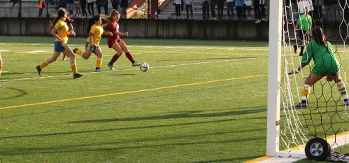 The first one was set up by Anna Affolter who came in along the left endline. Anna crossed the ball in front to where Bella Rosa was located. There was plenty of net to shoot at (as the picture shows) but Bella lifted the shot over the net.