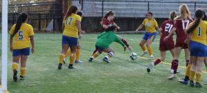 Sabrina broke down the right side and found sophomore Victoria Wilson cutting down the middle. GK Gabby Loughran dove out to get in front of Victoria’s shot attempt. Gabby’s dive not only blocked the shot but also took out teammate Caity Rooney. And so there the ball sat near the three of them and none of them could get it.