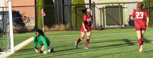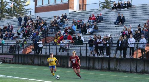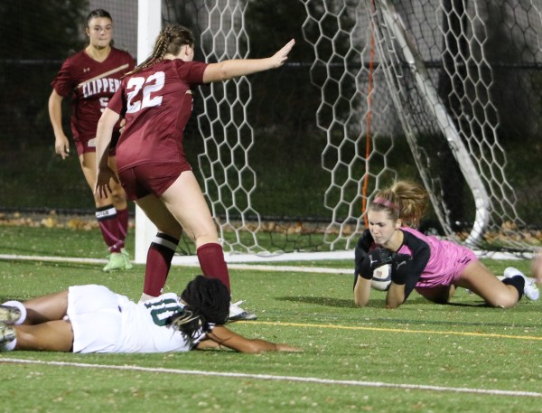 The physicality cost Pentucket (9-3-2) late in the first half. Newburyport sophomore Brela Pavao had possession in Pentucket’s box and was knocked down by a Sachem defender.