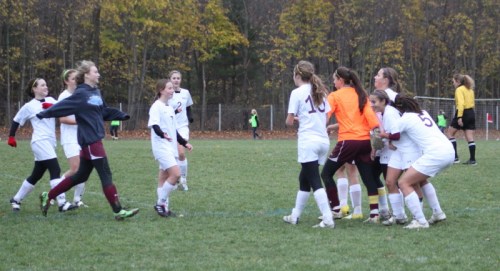 Another CAL All-Leaguer, junior Hannah Martin, drilled a long-range, left-footed rocket from the middle of the field over the head of the Bedford goalie after a pass from Amy Sullivan to break the scoreless deadlock in the first half.