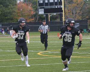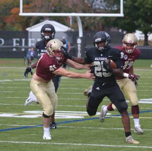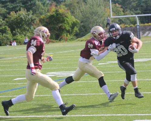 Defensive back Wigs Crowley had two interceptions for Bridgton. “We were in Cover 3 and I was just in the right place at the right time,” said the DB from Milton (MA). “Our linebackers played good underneath, so the quarterback had to lob the ball over them. I was just sitting there waiting.”