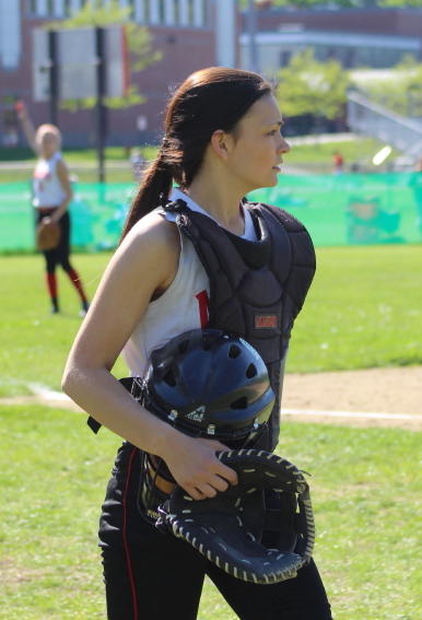 Jordan D’Orsi started the fourth inning for St. Mary’s. Consecutive doubles (Zoe Fitzgerald & Lauren Fedorchak) produced a run and after a walk Mia Nowicki came on in relief. Mia hit the first batter (Amanda Schell) she faced and walked the next batter (Alexis Boswell) forcing in a run. Here was a key point in this game: bases loaded with one out and Amesbury within three runs. Mia, however, came up big for the Spartans registering a strikeout and a popout to escape further damage.