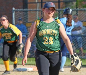 This game got away from Triton in the NR fourth inning. The Hornets put together three runs and I wish that there was instant replay of that inning so that I could be sure that I have what happened right! North Reading loaded the bases (singles Julia Howse & Abby Paine, walk Christina Simblaris) with no one out. Then the “what happened” part kicked in. Shortstop Bridget Sheehan fielded a grounder and tagged out a runner. No run scored, and the bases stayed loaded.